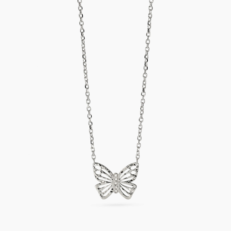 Descrizione: Girocollo in acciaio 316L e/o PVD giallo, lunghezza regolabile da 38 a 43 cm, con catena forzatina diamantata ed elemento martellato farfalla con cristalli. Dimensioni: larghezza catena 1.8 mm, farfalla 19x15.4 mm, pietre fi 1.25 mm