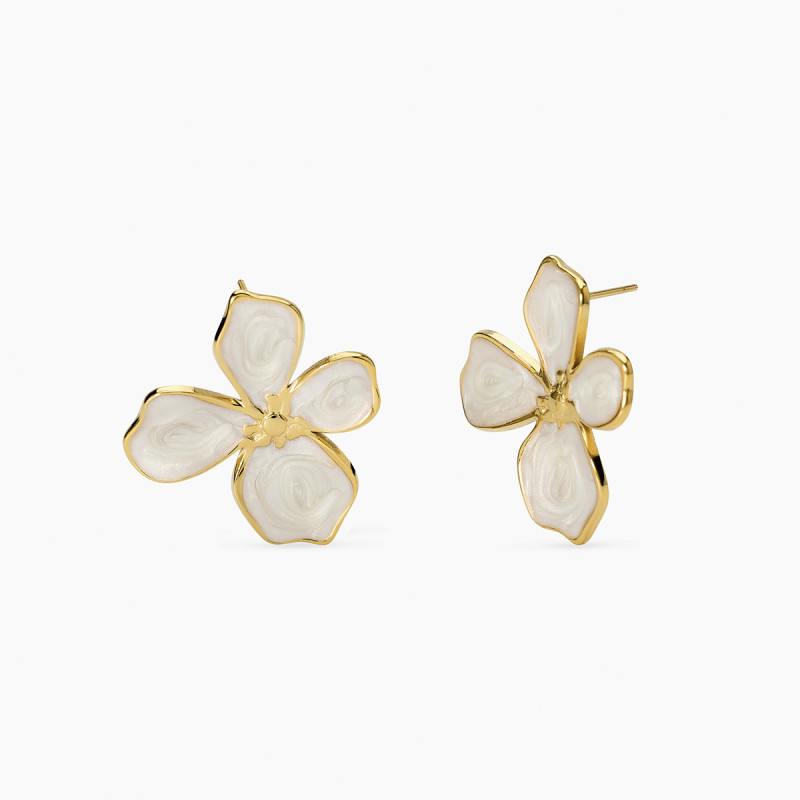 Descrizione: Orecchini in acciaio 316L e PVD giallo fiore smaltato. Dimensioni: orecchino 26x30 mm