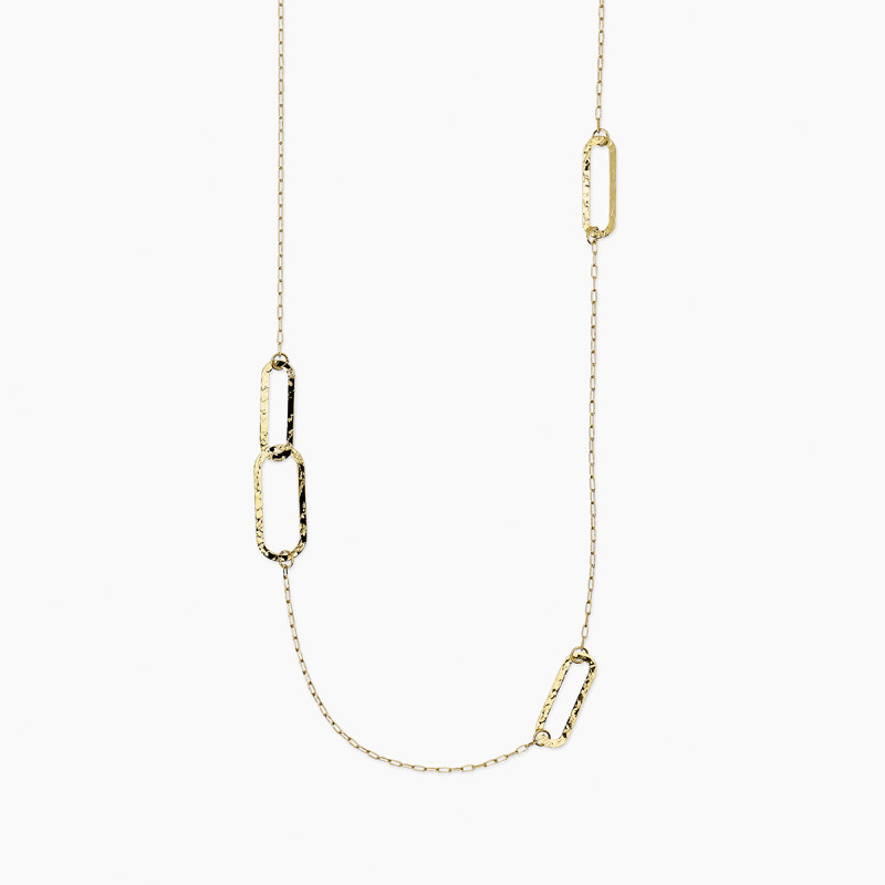 Descrizione: Collana in acciaio 316L e/o PVD giallo martellato, lunghezza 85 cm, con catena forzatina e maglie allungate. Dimensioni: larghezza catena 1.8 mm, maglie 32x14 e 26x10 mm