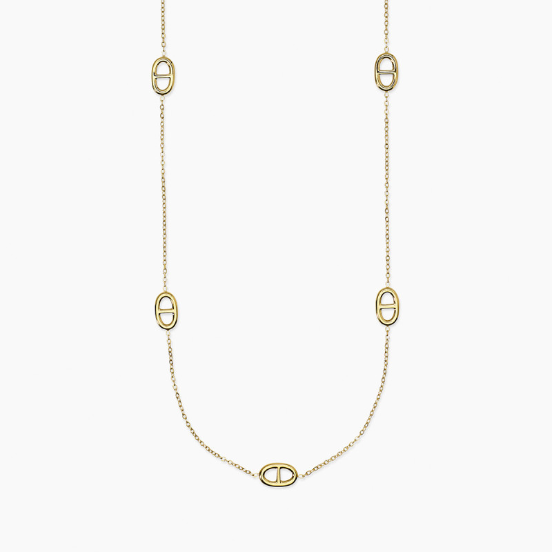 Descrizione: Collana in acciaio 316L e PVD giallo, lunghezza 85 cm, con catena forzatina ed elementi staffa. Dimensioni: larghezza catena 1.6 mm, elementi 14.3x8.7 mm
