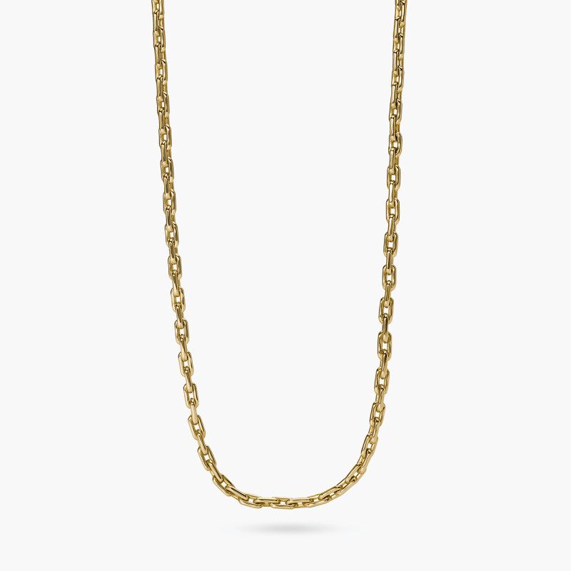 Descrizione: Collana in acciaio 316L e/o PVD giallo, lunghezza 60 cm, con catena a maglie allungate. Dimensioni: larghezza catena 2.9 mm