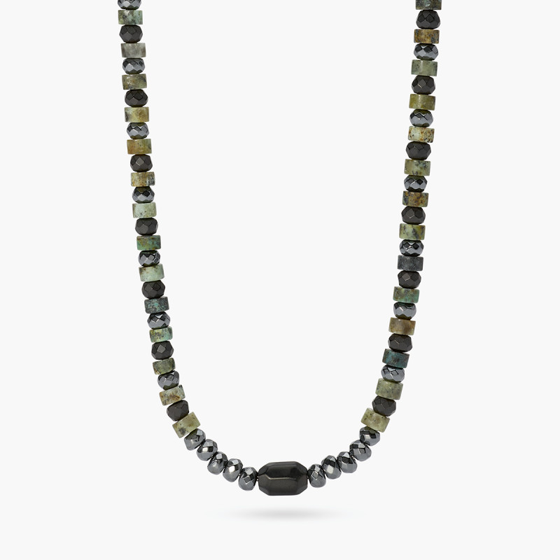 Descrizione: Collana in acciaio 316L, lunghezza regolabile da 45 a 50 cm, con elementi faccettati, ematite faccettata e cilindri in turchese verde. Dimensioni: centrale 8.2x5.6 mm, elementi 3.3x4 mm, pietre 3.3x4 e 2.5x4 mm
