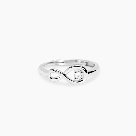 Descrizione: Anello in argento 925 rodiato con elemento infinito 13x4.3 mm e diamante lab-grown 0.06 ct F VS fi 2.4 mm, misura regolabile da 11 a 19