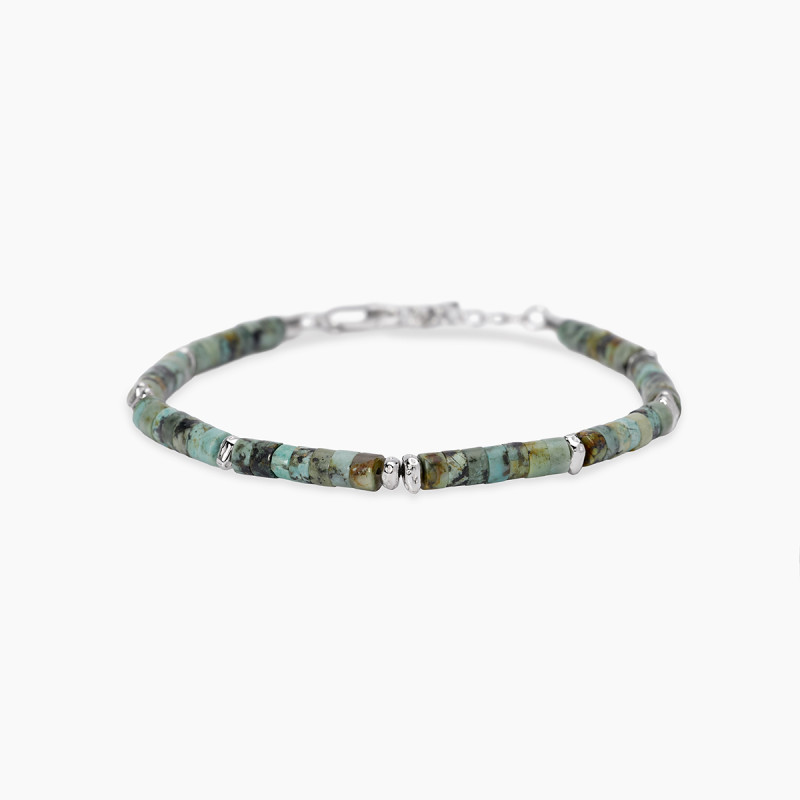 Descrizione: Bracciale in argento 925 rodiato con elementi triangolari martellati 2.3x5 mm e dischetti in pietra 2.5x4.5 mm, lunghezza regolabile da 19 a 21 cm