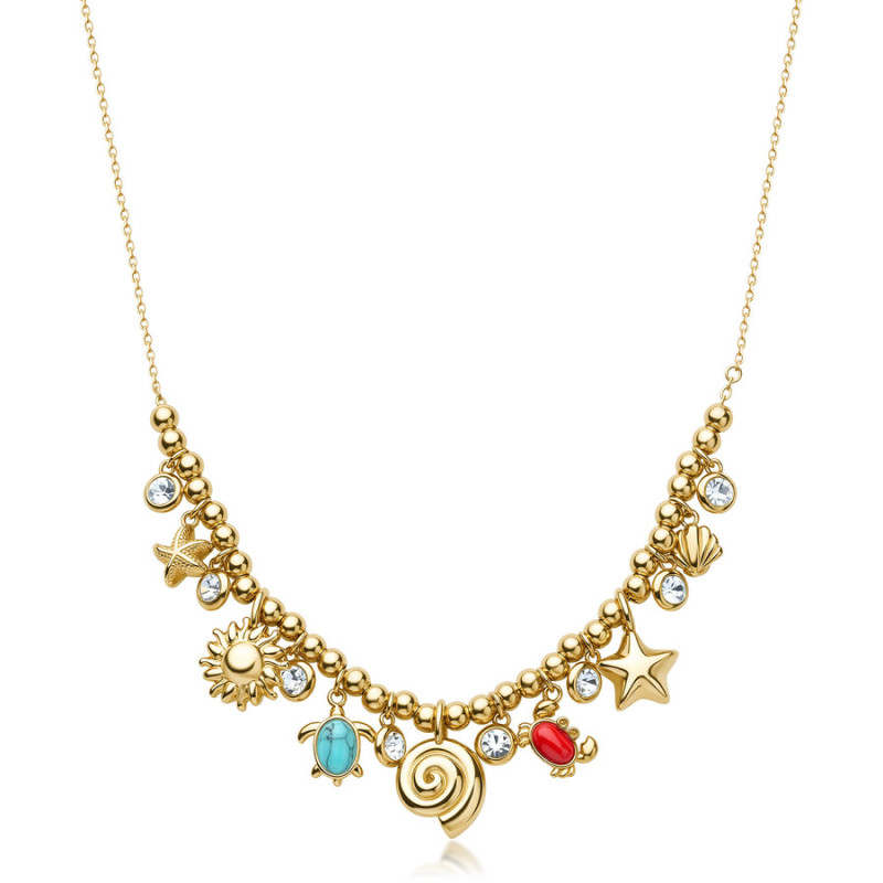 Descrizione: Collana in acciaio 316L, finitura pvd colore oro, con pendenti stella marina, conchiglie, sole, tartaruga con turchese ricostruito e granchio con corallo ricostruito e cristalli