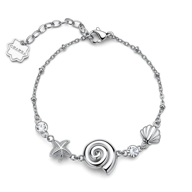 Descrizione: Bracciale in acciaio 316L e/o pvd oro con stella marina, conchiglie e cristalli
